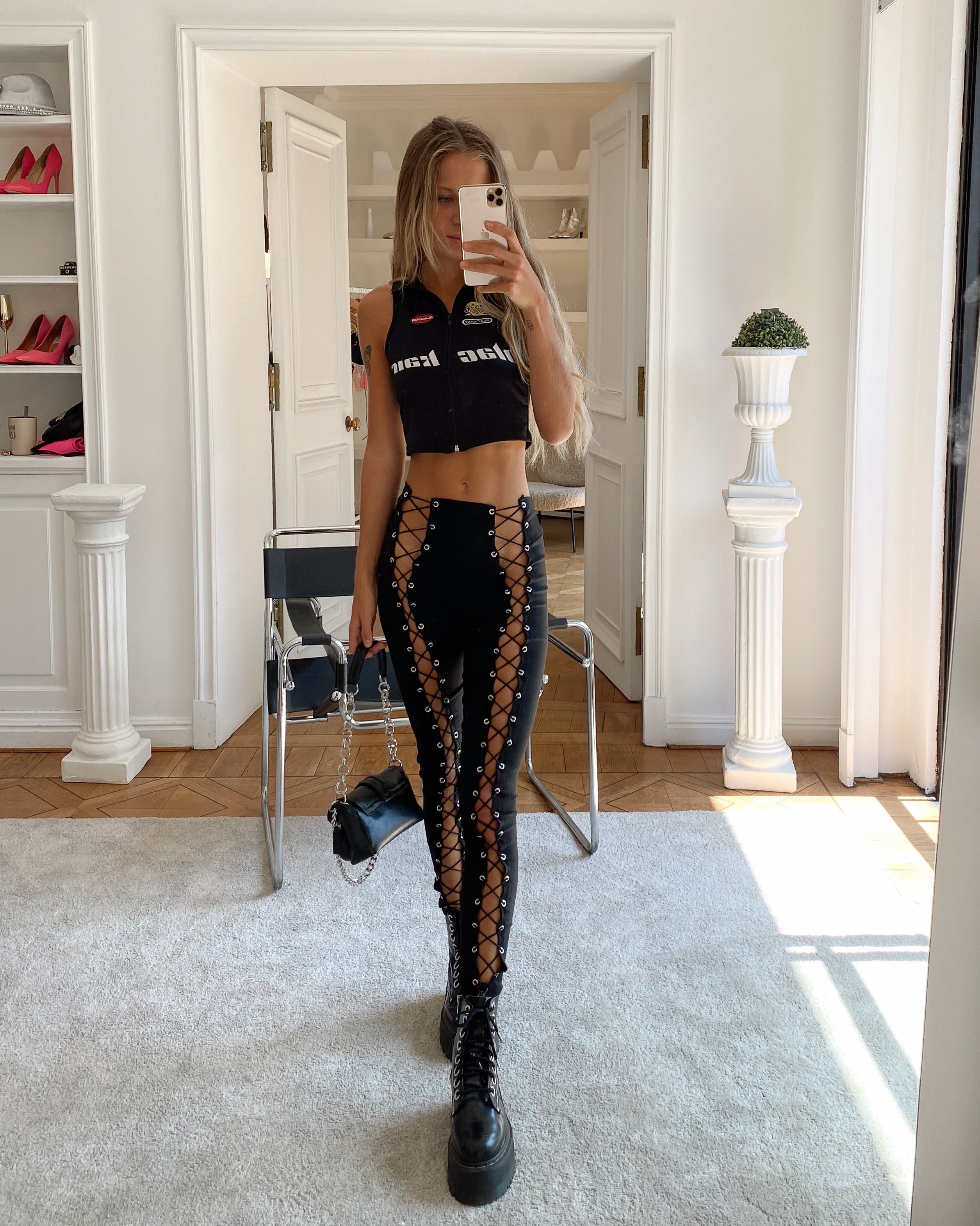 CALZA NEGRA CON APERTURA FRONTAL. TELA ELASTICADA.