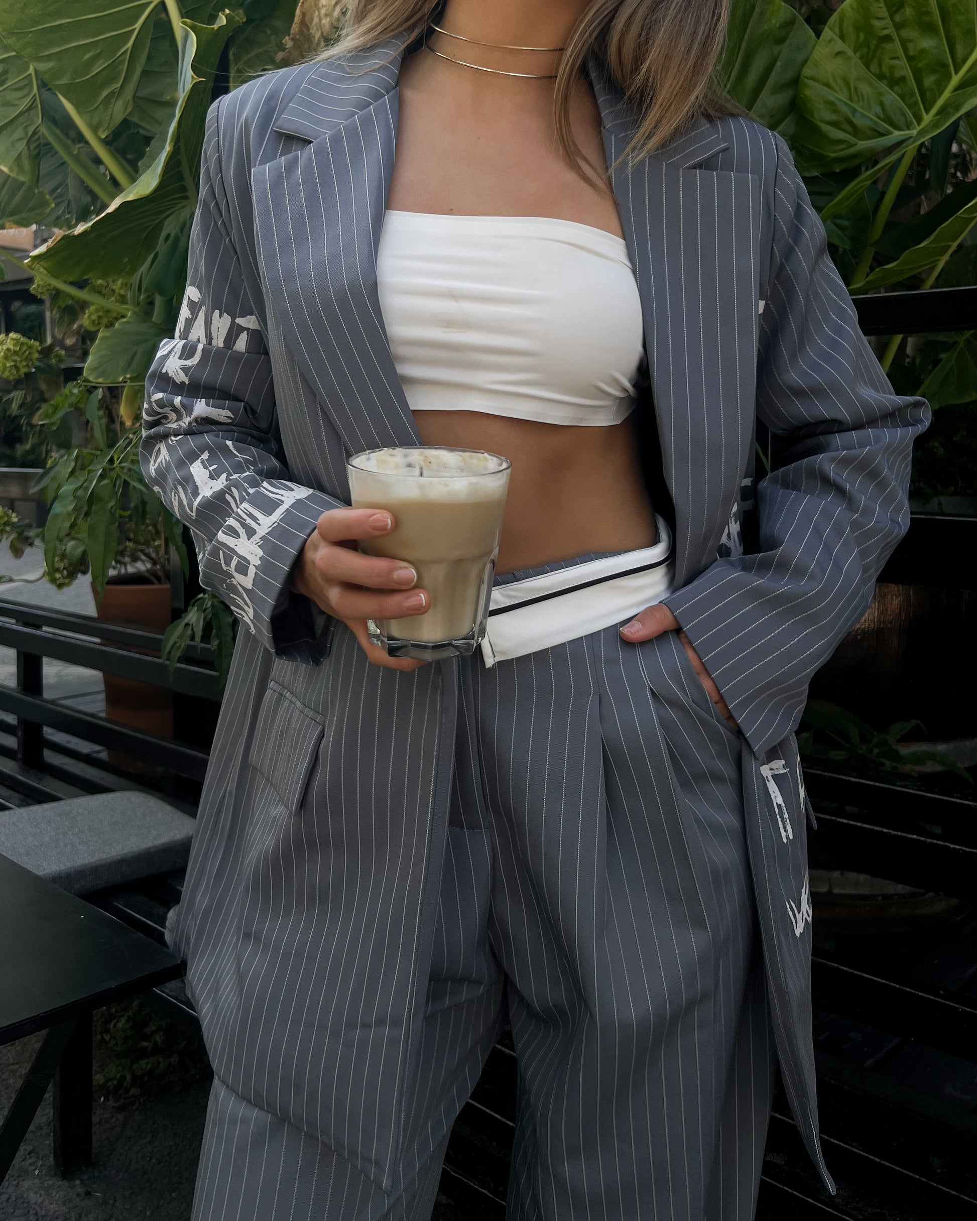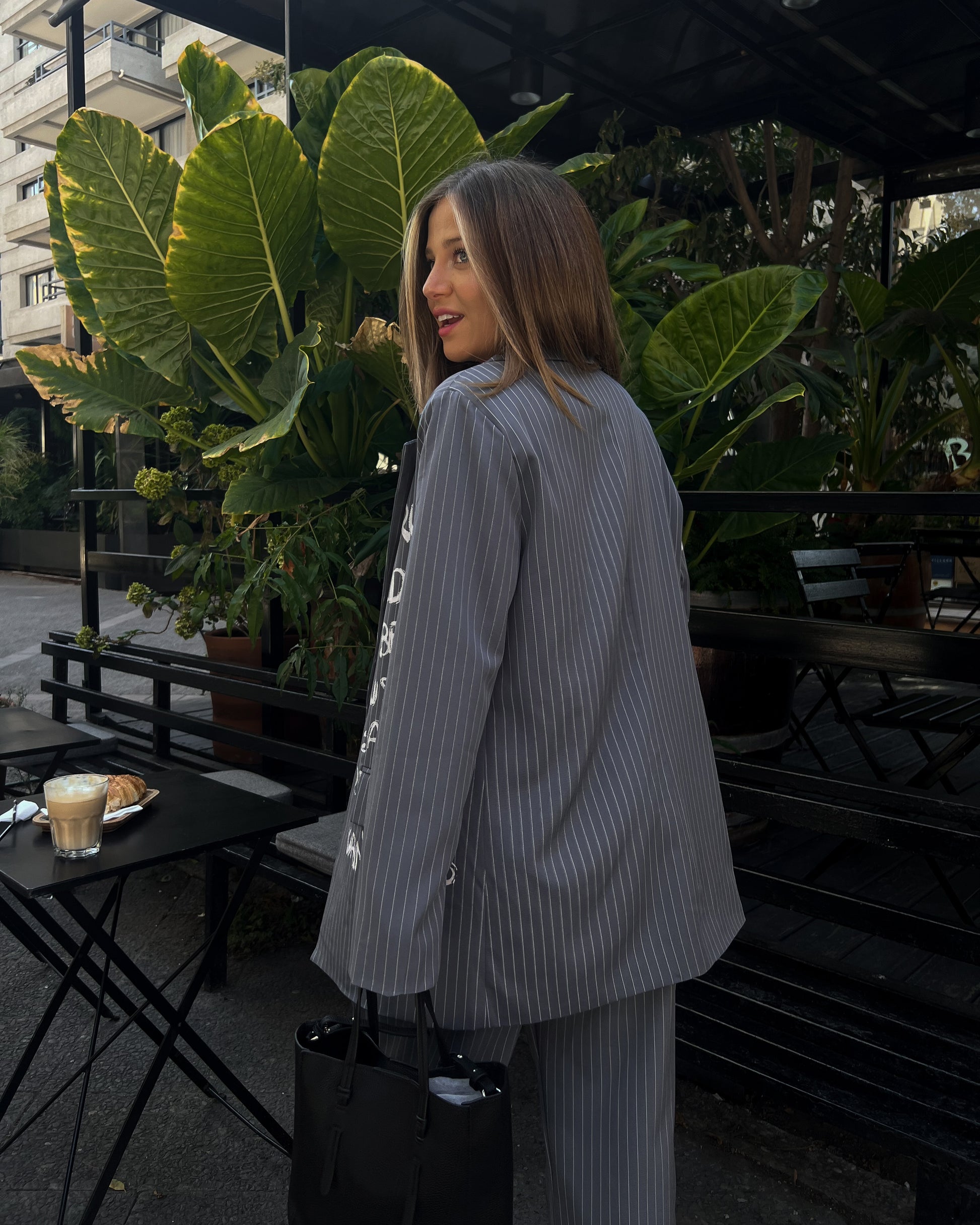 Este blazer letras y líneas diplomáticas es la elección perfecta para un look elegante y profesional. Es un modelo oversize que queda bien con pantalones sastreros o también con faldas y vestidos.