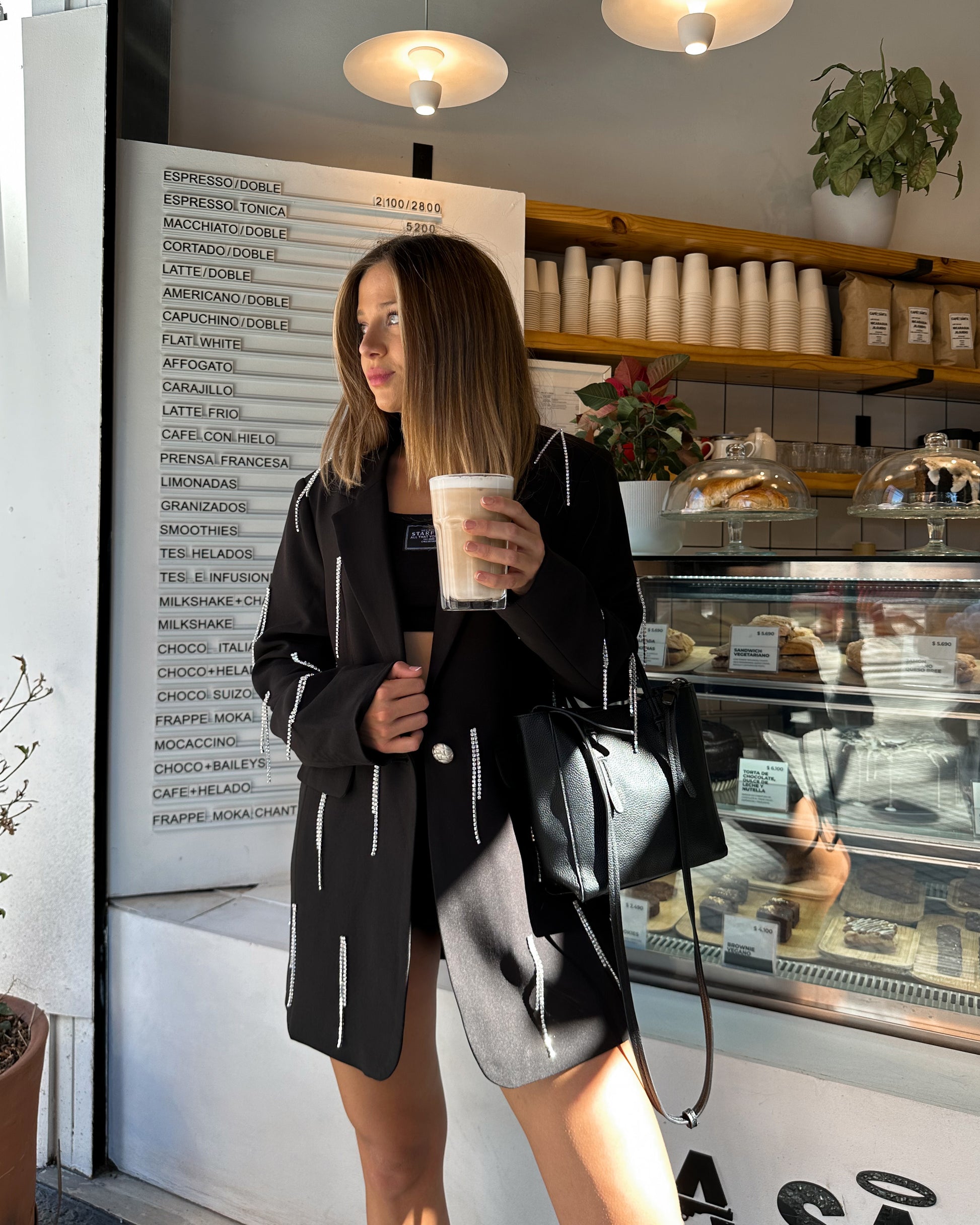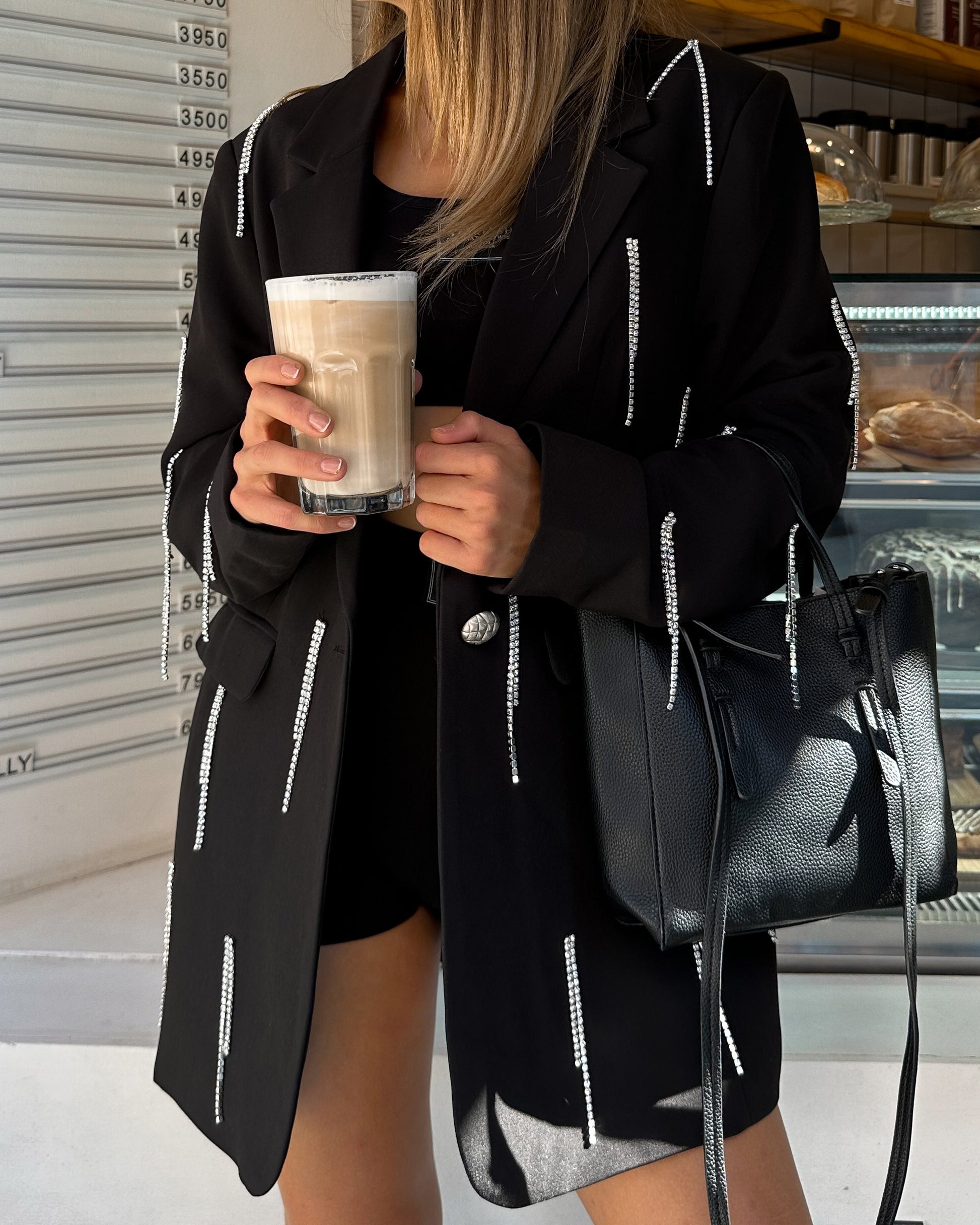 Blszer negro con brillos colgantes: perfecto para cualquier ocasión, día o noche. Añade un toque de brillo a tu look con esta prenda versátil y full combinable. Es de tela sastrera y lo puedes llevar en cualquier época del año.