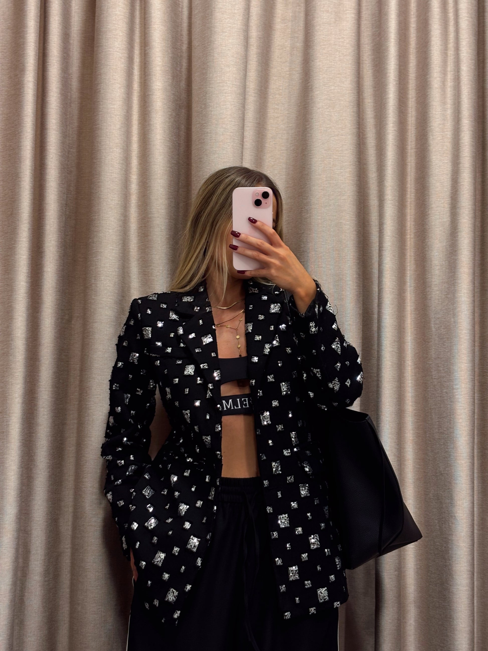 Blazer negro con cuadros de lentejuelas silver en distintos tamaños: brillo fino, distinto y con mucha presencia. Es perfecto para elevar un look simple y dejarlo listo para noche, eventos o salida.
