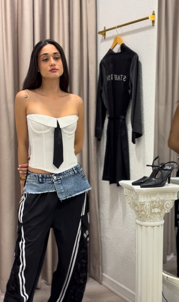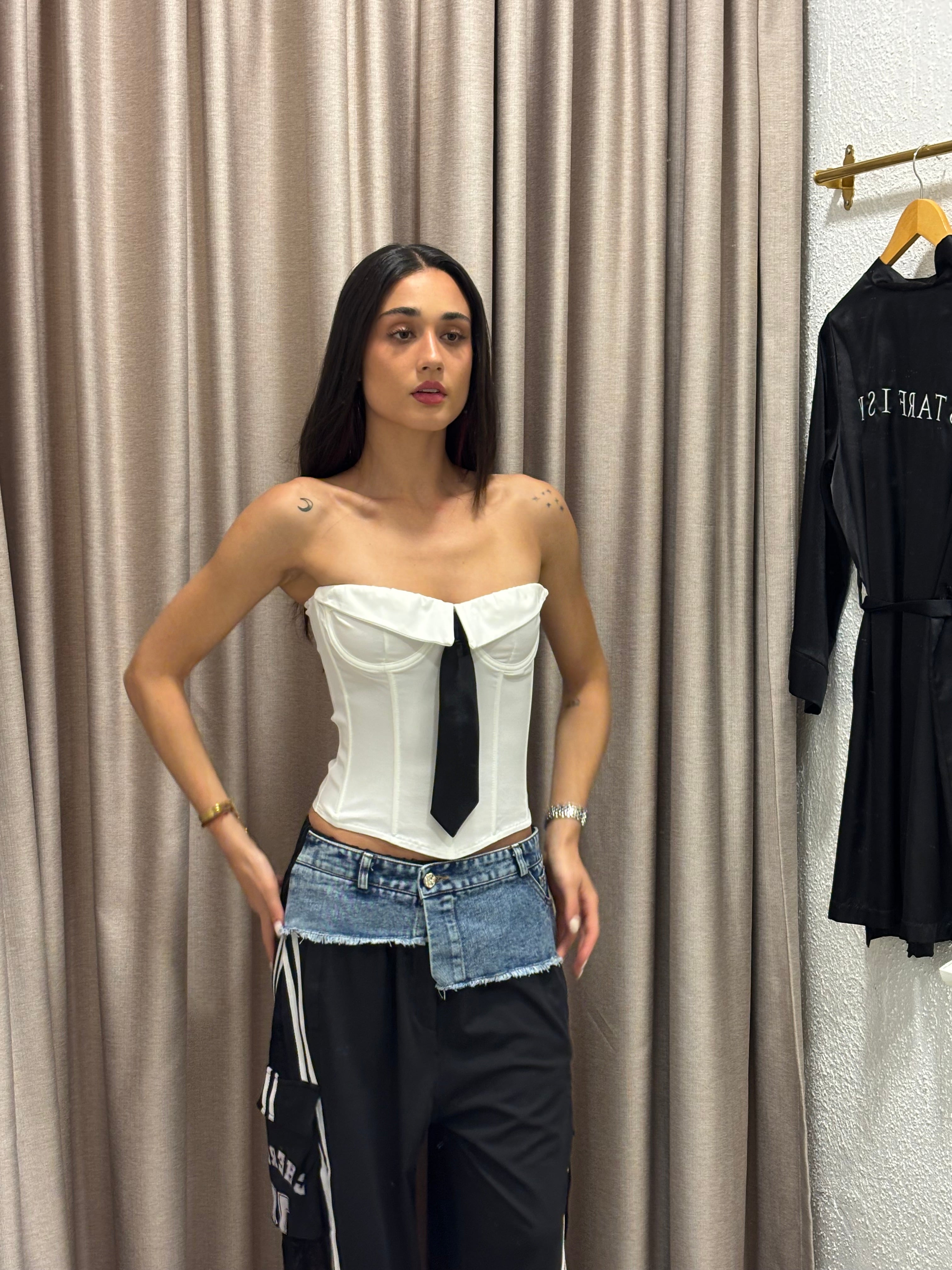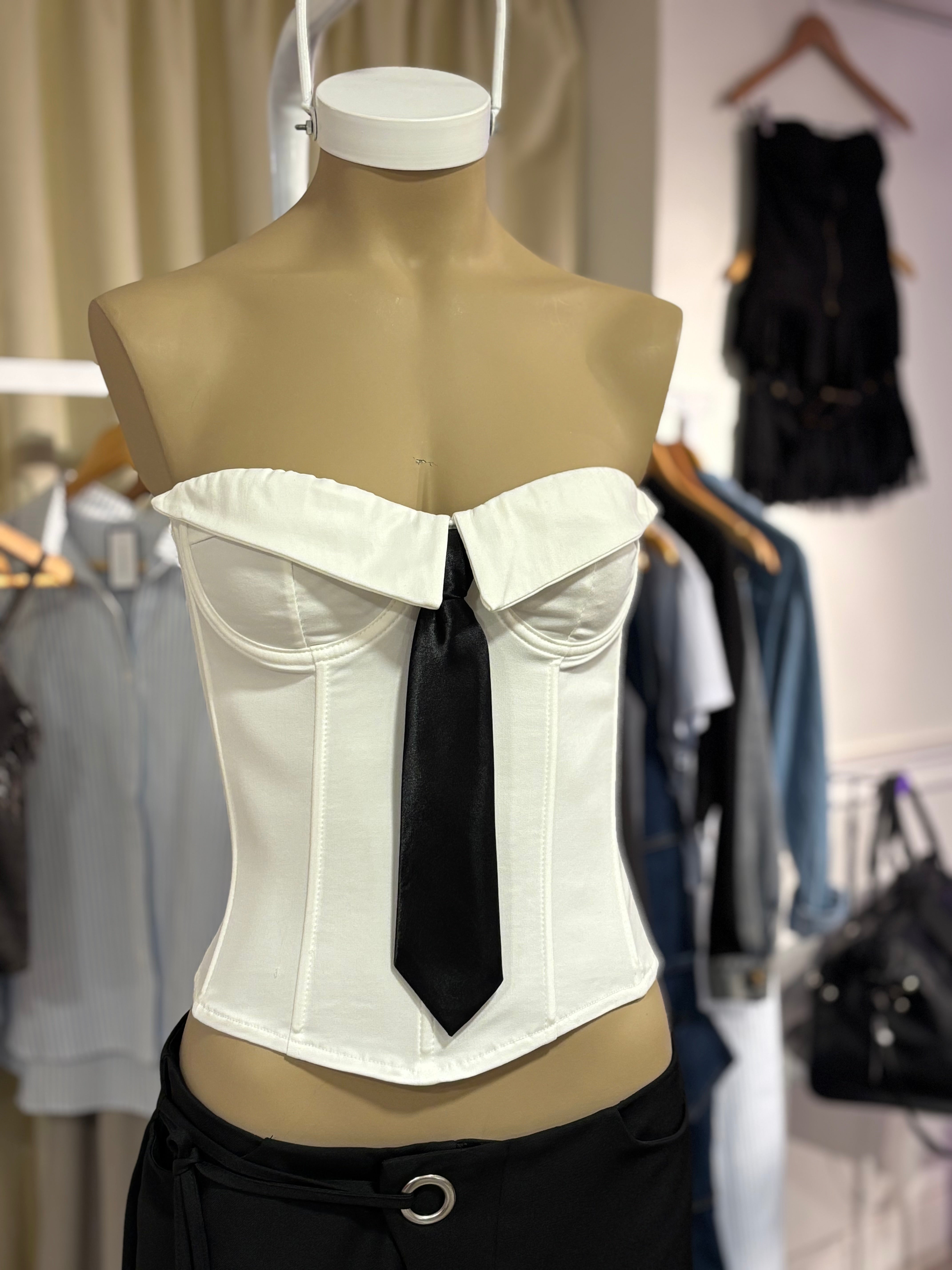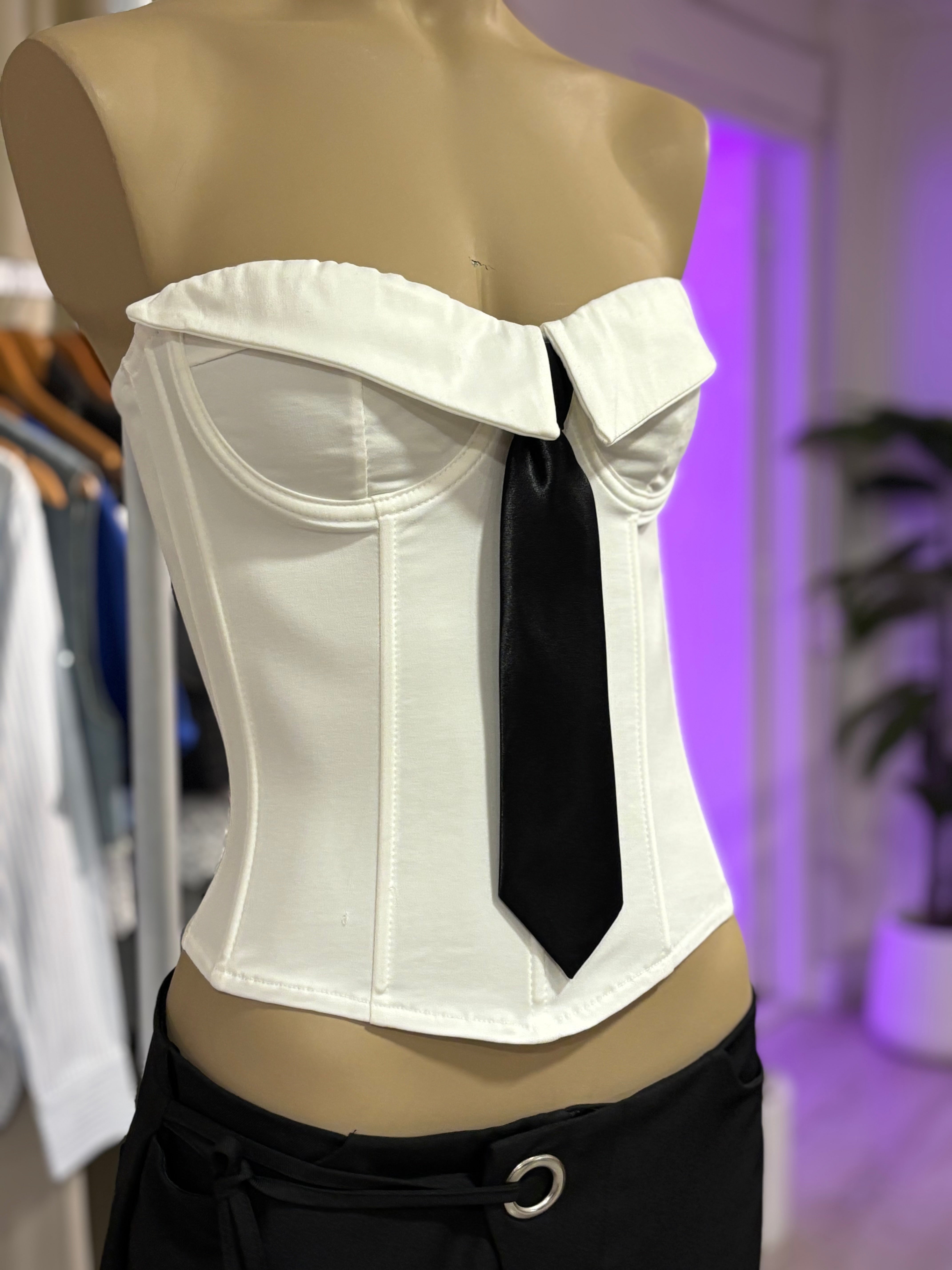 Corset blanco full elasticado, incluye corbatín negro para elevar tu look aún más.
